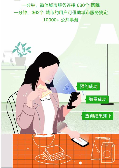在民生服務領域,可以說微信更是助力高效的代名詞。《報告》數據顯示,在一分鐘里,微信城市服務可實現連接680個醫院,讓患者可以預約掛號、醫保支付、在線收查報告,更能打通家庭醫生環節,看病、復診也能在家進行。